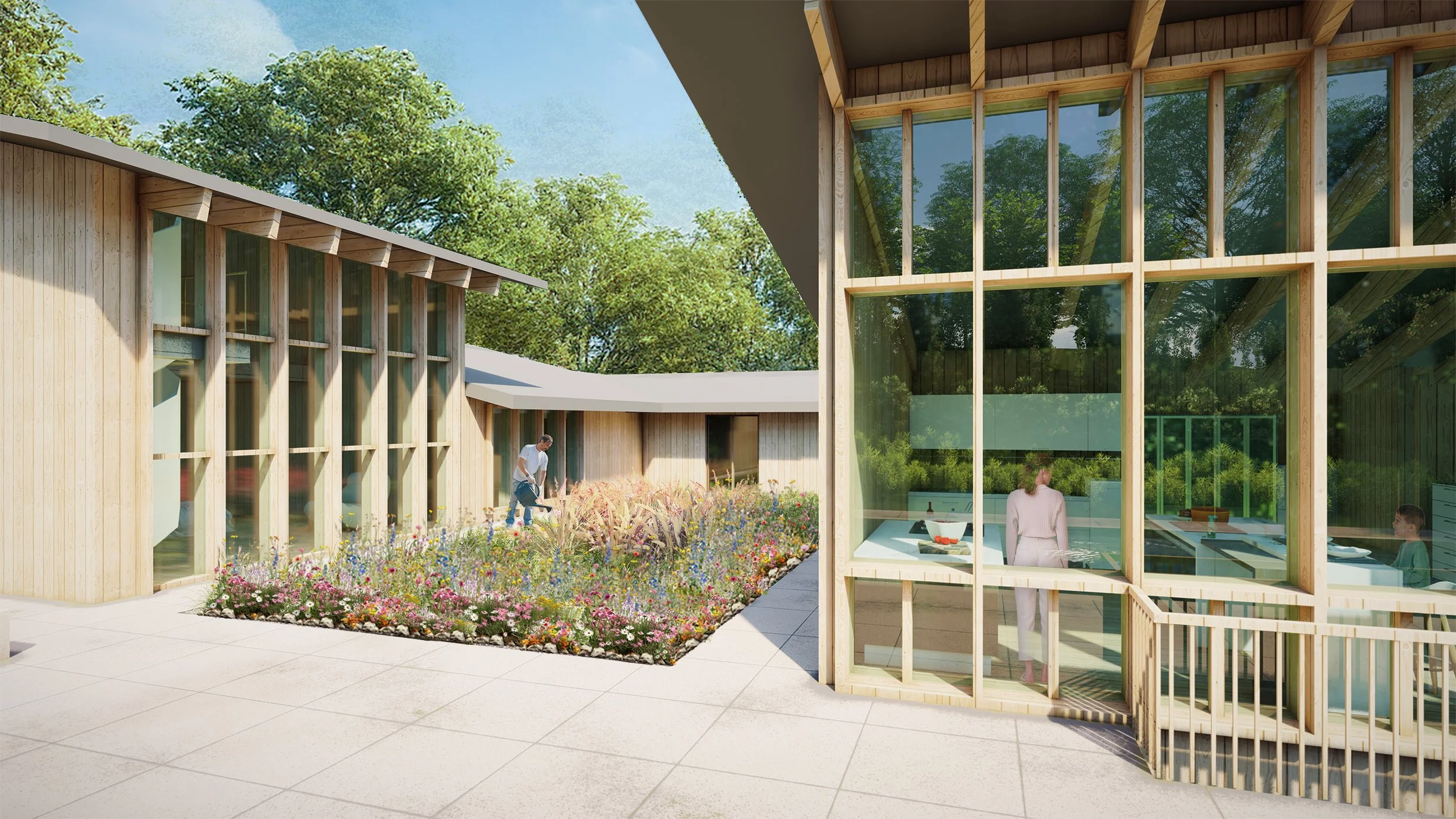 Brief: A warm, modern family home designed for indoor-outdoor living. Natural wood, pitched roofs, and expansive glazing connect the interiors to the surrounding forested landscape. The layout centers around a courtyard and pool, offering light-filled spaces for gathering, play, and retreat.